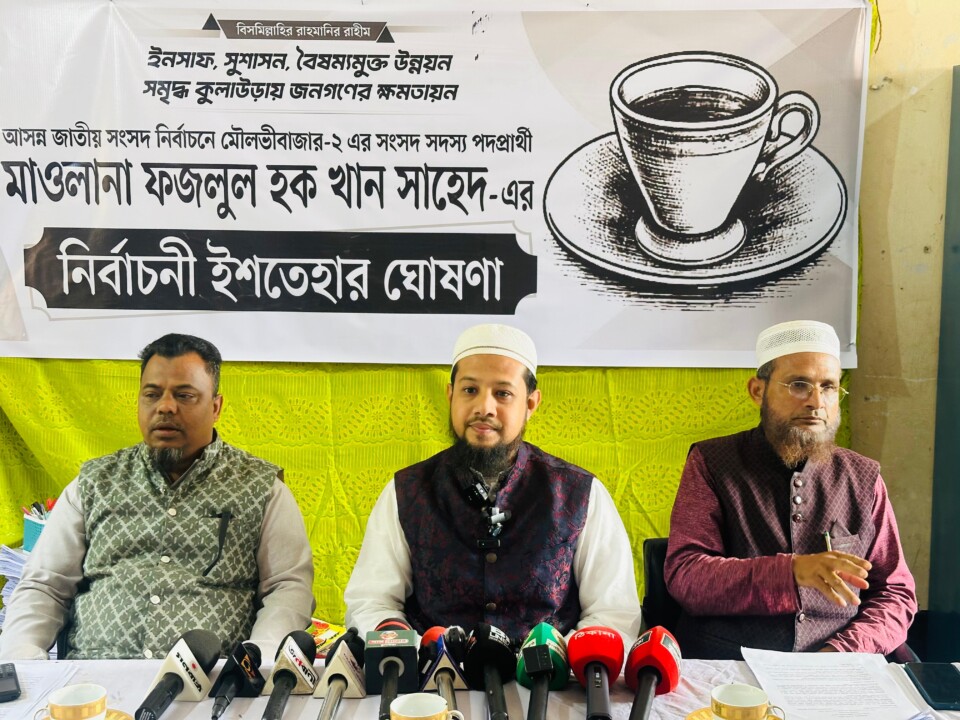 আসন্ন জাতীয় সংসদ নির্বাচনে মৌলভীবাজার-২ (কুলাউড়া) আসনের স্বতন্ত্র সংসদ সদস্য পদপ্রার্থী মাওলানা ফজলুল হক খান সাহেদ (কাপ-পিরিচ মার্কা) তাঁর নির্বাচনী